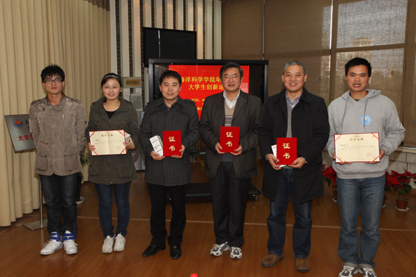 13组答辩完成后,整场论坛也进行到了尾声,同学们都受益匪浅,并对创新有了更加深刻的了解,会场的专家均对学生认真的态度、活跃的创新想法表示赞许,并对学生创新的开展给予充分的肯定与殷切的希望。学院许书记发表讲话,他表示大学生积极参加科研创新是一种前沿之举,有利于激发学生的创新精神,培养学生的创造意识。评委代表老师张硕也表示大学生创新是理论与实践结合的良好平台,我们应该积极鼓励那些敢于挑战敢于创新的同学。最后,科创代表导师印春生宣读了此次展板展示以及交流汇报的获奖名单,09海管的焦敏同学获项目交流特等奖,09海资张妙同学获展板展示“创新前沿”奖;海洋科学学院大学生创新社社长叶超宣读了荣获本届“优秀指导老师”称号的获奖名单,并为“优秀指导老师”代表们颁奖。