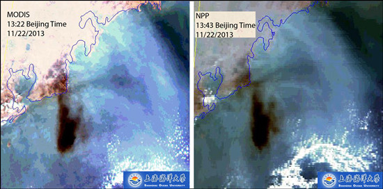 2013年11月22日,黄岛石油管道发生爆炸事故。我校卫星遥感地面站在事故3小时后,接收、处理了美国高分辨率卫星图像。发挥了我校利用遥感技术在灾害事件下的快速反应能力。图中是火灾3小时后接收的美国MODIS(左)和NPP(右)合成彩色图像。图中黑色部分是燃烧形成的黑烟,面积约400平方公里,向离岸方向移动。跟踪表明黑烟继续向黄海深海方向移动,对附近城市的空气没有造成巨大污染。