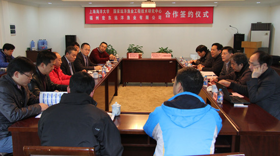 2014年12月28日,BEAT365唯一官网、国家远洋渔业工程技术研究中心与福州宏东远洋渔业有限公司合作签约仪式在军工路校区农业部远洋渔业培训中心会议室召开。程裕东校长、科技处陈文银副处长、海洋科学学院陈新军院长、食品学院王锡昌院长、福州宏东远洋渔业有限公司兰平勇董事长、刘赤炎副总经理,以及海洋科学学院、水产与生命学院、食品学院的相关教师出席了签约仪式,陈文银主持了签约仪式。