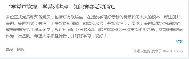 为进一步检验支部“两学一做”学习教育的效果,切实提高党章党规党纪的学习宣传,巩固和深化党的群众路线教育实践活动。以上海市教委举办的“学党规党章,学系列讲话”知识竞赛为契机,6月1日-7日,发动14海研支部党员积极参加“两学一做”知识竞赛。
