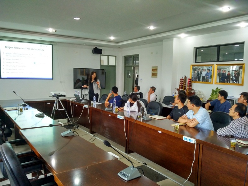 稍微休息之后,Hefeng Dong教授介绍了挪威科技大学教育情况和海洋声学研究及教学方面的工作。结合挪威发达的渔业产业,挪威科技大学除了雄厚的海洋渔业师资力量外,在海洋声学方面也具有了一定规模:水声实验所用的各种仪器设备和NTNU自己的科学考察船。