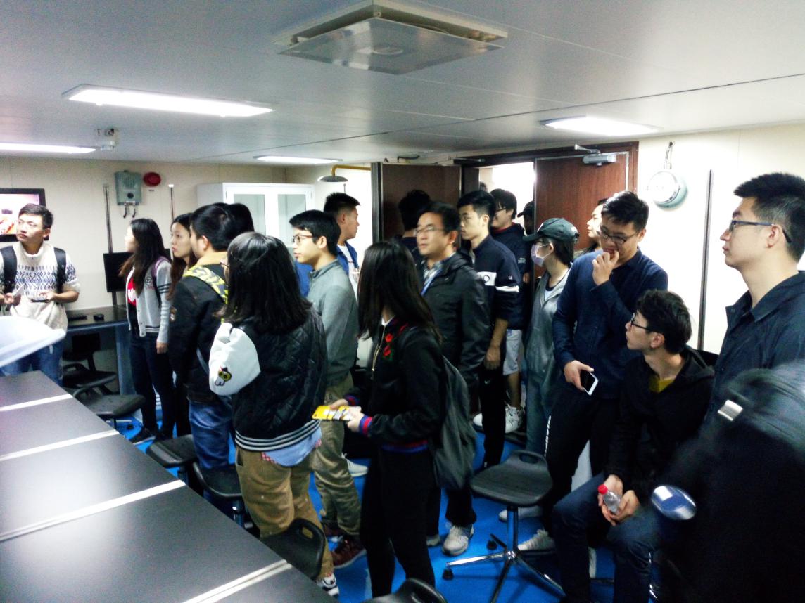 在船长的带领下,学生们从船舱顶部到底部逐层参观。和蔼的老船长为学生们认真的讲述“淞航”号上的每一处细节,每一个与其它科考船的不同之处,还为学生们介绍了每一件实验室每一个仪器仪表的用途,同学们在认真听讲之余不断的赞叹“淞航”号的雄伟壮观。船内的陈设一应俱全,除了生活研究必备的船员室和一系列专业实验室外,在驾驶室还供养着一盆盆绿色植物,为远洋航行的船员提供了更有趣的生活环境和作业氛围。相比于以前的作业渔船,“淞航”号上科研设备更先进,基础设施更完善。