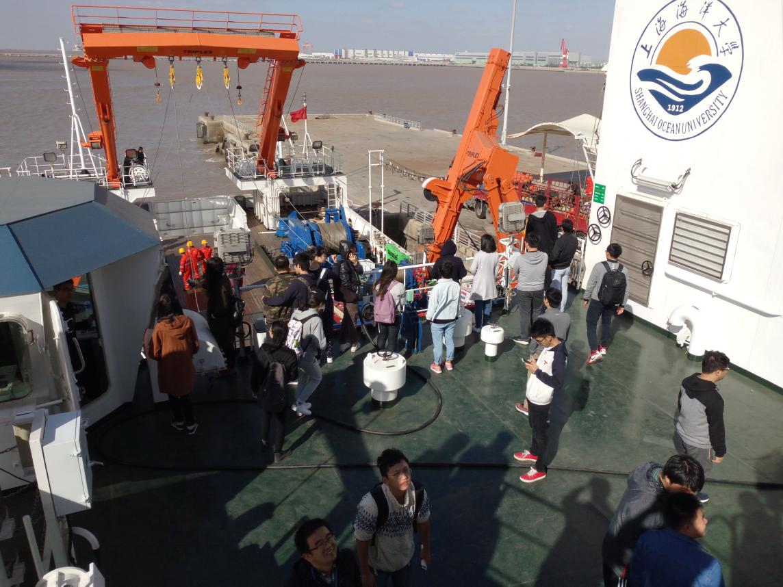 2017年11月4日上午,伴着正好的阳光,不燥的微风。海洋科学学院16级海渔系学生抱着激动的心情跟着带队老师一起参观了的“淞航”号科考船。一大清早海渔系的学生们就来到了芦潮港码头,虽然海边的风有些大,但在蓝天白云的衬托下“淞航”号显得更加威武,船上海大的校徽显得格外鲜明。