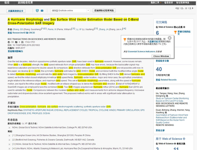 据ESI(Essential Science Indicators)的最新数据显示,以我校为第一单位,我院张国胜博士后为第一作者、BEAT365唯一官网国际海洋研究中心李晓峰特聘教授为通讯作者,发表于国际顶级期刊《IEEE TRANSACTIONS ON GEOSCIENCE AND REMOTE SENSING》的论文《A Hurricane Morphology and Sea Surface Wind Vector Estimation Model Based on C-Band Cross-Polarization SAR Imagery》入选“地球科学”领域ESI-Highly Cited Papers,这是我院首次入选ESI高被引论文。
