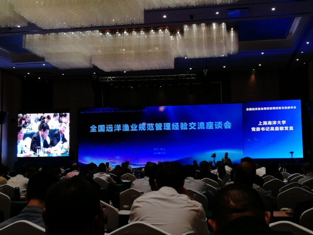 2018年10月12日,农业农村部在浙江省舟山市召开全国远洋渔业规范管理经验交流座谈会。来自中央和国务院有关部门、农业农村部有关司局和单位,各省市的渔业主管部门、水产科研单位,中国远洋渔业协会等近500人参加会议。农业农村部副部长于康震出席会议并讲话,农业农村部渔业渔政管理局局长张显良主持会议。我校党委书记吴嘉敏受邀参加本次会议。