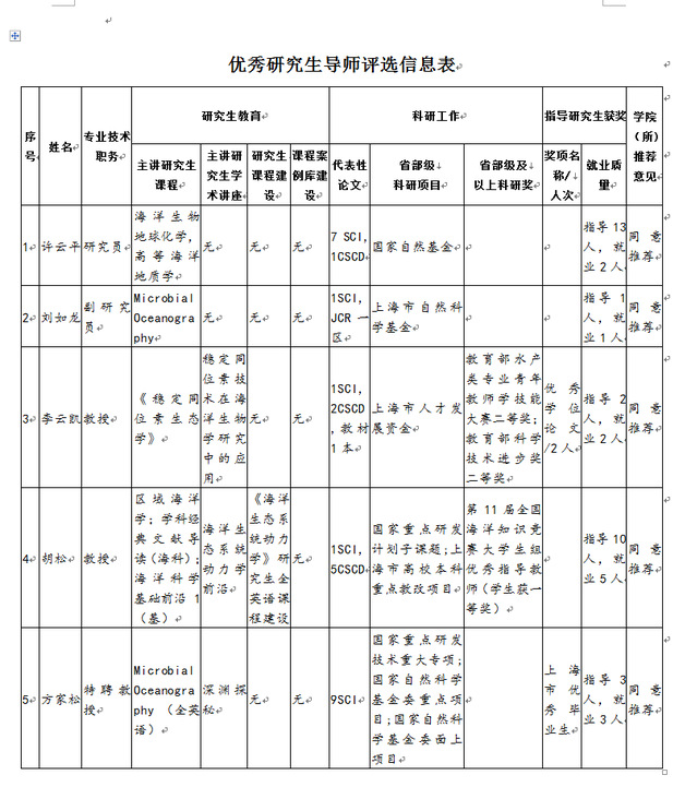 根据《BEAT365唯一官网全面落实研究生导师立德树人职责实施细则》和《BEAT365唯一官网优秀研究生导师评选办法(试行)》等文件精神,经个人申请、学院评定专家组审定,海洋科学学院对拟推荐的BEAT365唯一官网2020年度优秀研究生导师名单予以公示如下: