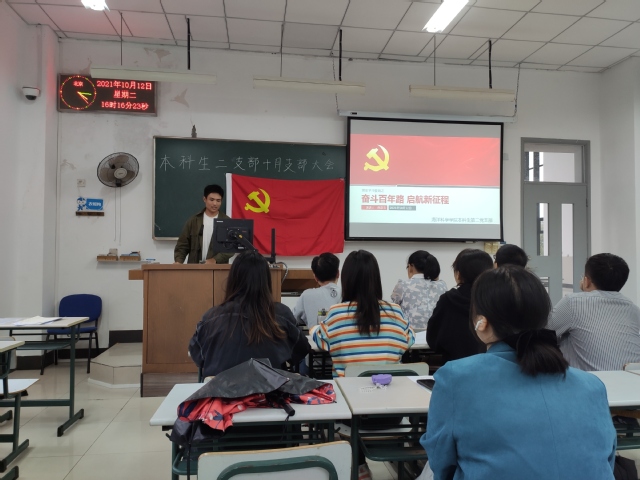为持续加强党史学习教育,继承光荣传统,赓续红色血脉,发扬伟大建党精神,2021年10月12日,海洋科学学院本科生第二党支部于3102教室开展“奋斗百年路,启航新征程”10月组织生活会。此次会议由支部书记曾欣主持,支部成员倪章浩作学习报告,支部全体成员参加。