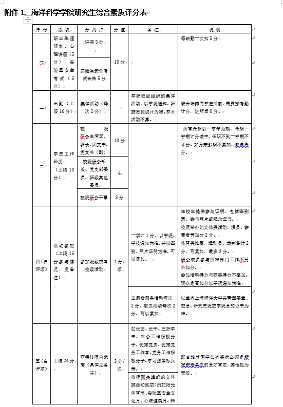 第十一条 研究生综合素质A,总分为10分,评分标准见附件1:《海洋科学学院研究生综合素质评分表》。