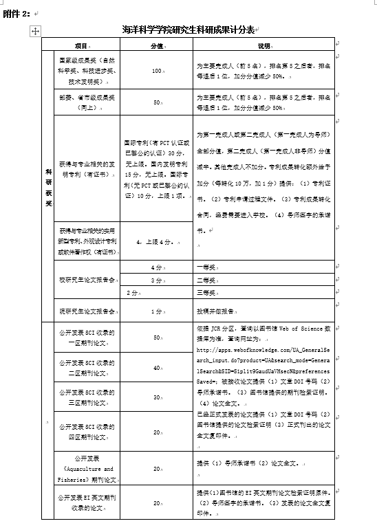 第十三条 研究生科研成绩C,按照附件2:《海洋科学学院研究生科研成果计分表》进行科研计分。