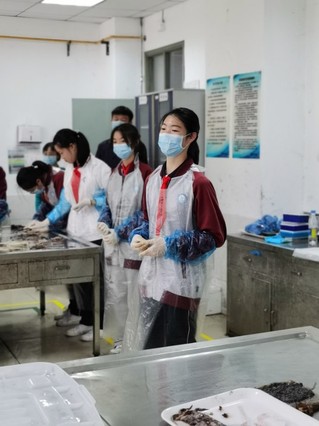 听完了讲座,大家来到一楼的实验室,亲自尝试解剖实验,学院为他们提供了相关的实验样品。通过前期陈子越博士细心耐心的讲解,临港一中同学们都对头足类动物产生了浓厚的兴趣,能够亲手解剖鱿鱼更是让他们兴奋不已。
