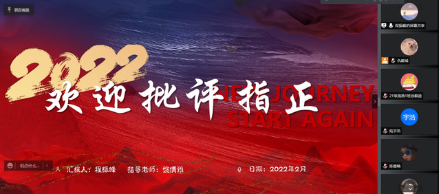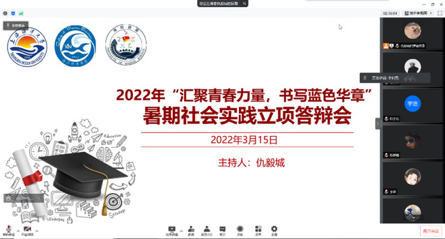 为引导广大青年走出校门、贴近社会,树立爱国荣校情怀,将理论联系实际,勇做担当民族复兴大任的时代新人,海洋科学学院团委积极响应校团委的号召,开展2022年大学生社会实践立项答辩活动。3月15日下午,16支社会实践队伍齐聚云端,展示自我,互相学习。海洋科学学院团委书记姚倩雅、学工办主任张宜振兼职辅导员李钊丞担任答辩评委。