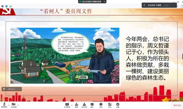 会上,牛瑞博从两会中习近平总书记指出的中国特色社会主义新型政党制度、三严三实、乡村振兴的“五个振兴”、五个“必由之路”和五个“战略性有利条件”进行理论分析,并结合小庙村书记“萌婶儿”赵会杰和“看树人”委员周义哲的事迹和提案,指出两会对于农村工作和生态环境改善的持续关注。在新的属于奋斗者的好时代里,我们要以坚定的决心、信心和恒心,走好“必由之路”,以强大的志气、骨气、底气,用好“有利条件”,稳大局、应变局、开新局。
