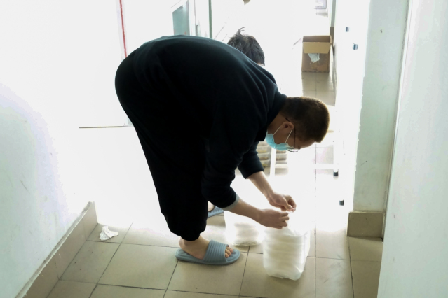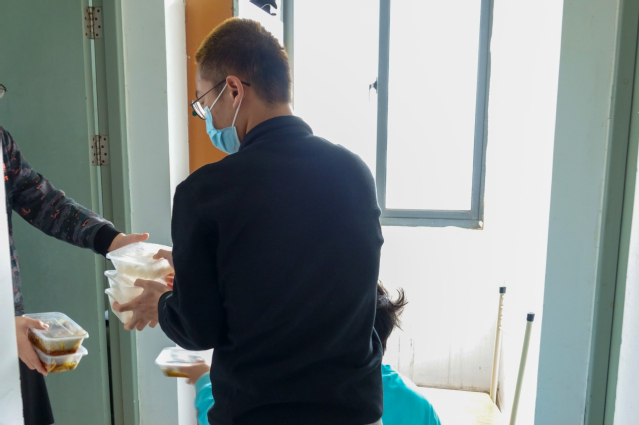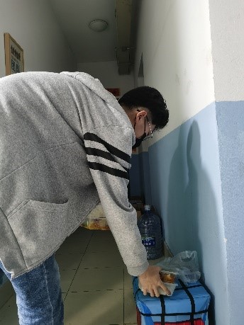 钟懋胜在志愿报名的最后一刻成为该楼层的送餐志愿者,心中充满荣幸的他打心底希望自己能在这样特殊的时期做一些力所能及的事情。他表示自己的工作内容不多,每天三餐准点去电梯口接餐分发,偶尔在群里提醒大家一些注意事项,志愿服务过程中也认识了不少楼层的同学,收获良多。