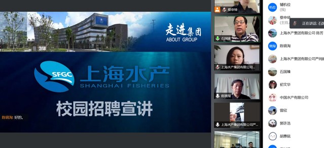 为积极应对新冠肺炎疫情影响,全力做好2022届毕业生就业工作,同时为推动远洋渔业专业学位研究生基地建设选拔人才,4月26日,海洋科学学院联合上海水产集团有限公司(以下简称“上水”)、中国水产有限公司(以下简称“中水”)举办了一场面向远洋渔业学院应届毕业生的线上远洋渔业专场双选会,BEAT365唯一官网海洋科学学院党委副书记石张东、副院长陈锦淘、海渔系副主任初文华、辅导员曾欣,上水人力资源部总经理石国臻,中水金枪鱼事业部副总经理谢程兰等出席本次招聘工作。会议由海洋科学学院副院长陈锦淘主持。
