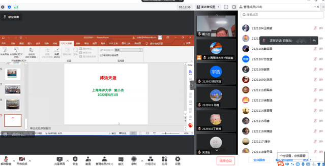 向海图强,搏浪天涯,为了积极响应五一劳动节,学院于5月1日下午特邀上海市先进工作者(劳模)戴小杰教授为21级全体学生开展了主题为“赓续红色血脉,传承海洋精神”的线上讲座,讲座由辅导员张宜振主持,学院党委副书记石张东、部分专业教师、辅导员及学生家长参加。