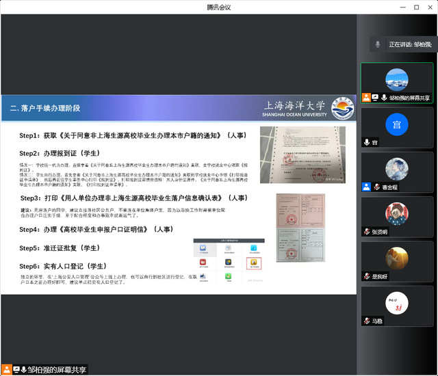 邹柏强详细讲解了落户提交的材料清单、流程时间线,并解读了落户政策。海洋科学学院捕捞学、渔业资源专业属于双一流学科的专业,毕业生申请户口时批复时间相对短。同学们根据文件准备好相关的材料,办理起来很顺利。邹柏强补充,长三角的很多城市出台了毕业生就业优惠政策,同学们要多留心周边城市的落户政策,做适合自己的决定。