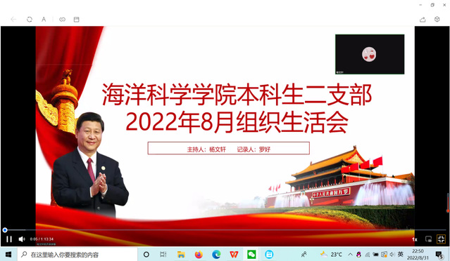 2022年8月31日,海洋科学学院本科生二支部于线上召开了本月的组织生活会。本次会议由支部预备党员杨文轩主持,全体支部成员参加。此次会议中,全体党员同志认真学习中共上海市委第十二次党代会等理论时事内容,深入思考,领悟会议重要精神,并结合暑期学习生活开展批评与自我批评,以及畅谈新学期规划。