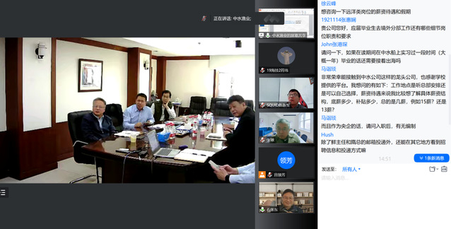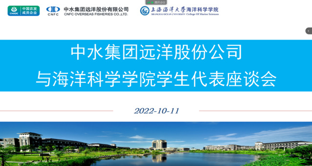 为进一步推动海洋科学学院2023届毕业生就业工作,中水集团股份有限公司与我院在10月11日下午13:30联合举办腾讯会议线上就业座谈会。中水集团远洋股份有限公司邓荣成副总经理、组织人事部鲜其洲主任、生产运营部隋恒寿总经理、金枪鱼围网部谢程兰副总经理、海洋科学学院陈新军院长、张敏教授、学院就业指导员张宜振、毕业班辅导员宫领芳、张漫秸以及毕业生在内的百余名师生代表参会。