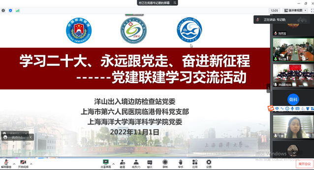 11月1日下午,海洋科学学院党委联合洋山出入境边防检查站党委、上海市第六人民医院临港骨科党支部集中开展党的二十大精神学习。洋山出入境边防检查站党委书记、站长张宝科,站党委委员、副站长谢卫星,站党委委员、政治处主任徐贤力,站办公室主任、党支部书记陈念,后勤处处长、党支部书记杨大勇,以及机关全体民警、职工、文职人员参会。上海市第六人民医院临港骨科党支部书记詹玉林、副书记文根、骨科护士长胡 平,以及其他科室党员参会。海洋科学学院院长陈新军、副书记石张东、副院长胡松、副院长朱江峰、副院长陈锦淘、专职组织员刘丙宝、海渔系主任李纲、海科系主任许云平、教工支部书记叶旭昌、魏永亮等人参会。会议由石张东主持。