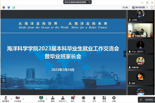 2023年大学毕业生创历史新高,毕业总人数高达1158万人,教育部印发《关于做好2023届全国普通高校毕业生就业创业工作通知》及上海市对各高校就业工作的重要指导,面临就业形势严峻复杂、就业结构矛盾突出,学院如何进一步做好毕业生的就业指导服务工作尤为重要。海洋科学学院于2月24日晚18:00召开2023届毕业生就业工作交流会暨毕业班家长会。会议由就业指导员张宜振主持,院长陈新军,党委副书记石张东,毕业班辅导员张漫秸,优秀毕业生代表以及2023届毕业生家长参加会议。