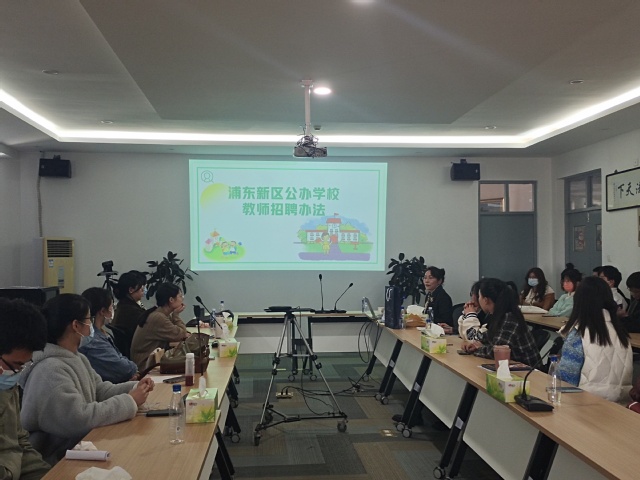 之后,陆英就浦东新区公办学校教师招聘政策进行介绍,详细阐述了按需招录、公开择优等主要招聘原则,并分别从应届毕业生及社会人员两方面对招聘条件进行解读。对于部分同学对教师职业招聘流程不清楚的问题,讲座中也以流程图等直观形式向大家进行了展示。针对教师的职业发展,陆英以“双新”背景下教师职业的定位、职责和价值来进行深入分析,并引用中国著名教育家、华东师范大学教育学终身教授叶澜关于教育的论述,使得同学们对教师职业有了更加清晰且深刻的认知。