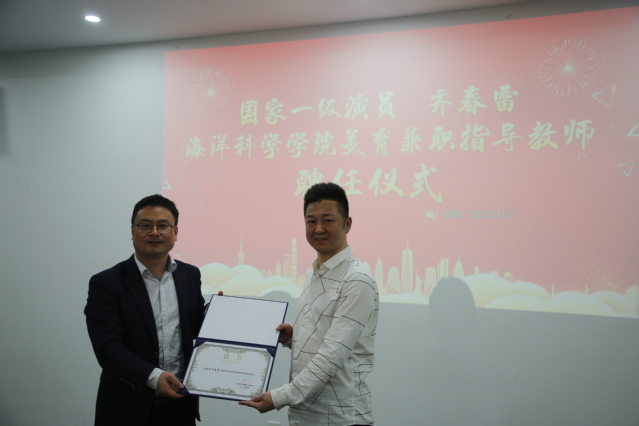 之后由石书记亲自为齐春雷先生颁发聘书,聘任齐春雷先生为海洋科学学院美育兼职指导教师。