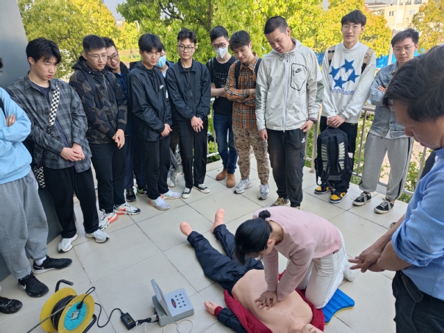 在急救演练环节,陈锦淘借助CPR心肺复苏模拟人等专业教具,为大家演示正确的急救方法。随后,每一位师生都模拟了遇到心脏骤停情况后的急救操作,在老师指导下调整按压位置和动作,直到模拟人显示已正确施救。