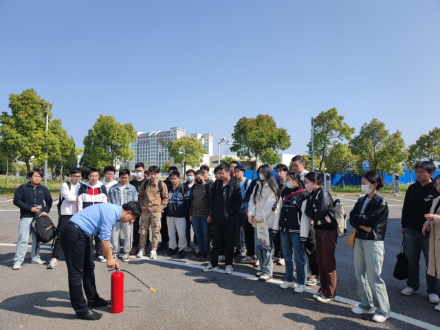 在消防训练环节,陈锦淘为大家详细讲解了灭火器、灭火毯的使用方法、灭火的规范操作流程等,并进行实操示范。在工作人员指导下,师生们依次上前亲身实践,经过几轮实操体验后,师生们基本掌握了灭火器的使用原理和方法。