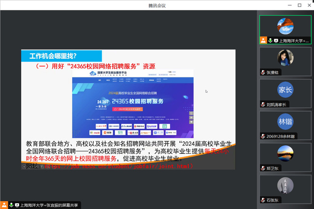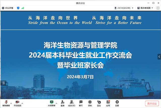 家校协同联动,合力共促就业。陈新军强调了本科毕业生就业的重要性,学院也会积极组织校园专场招聘会,分类指导、动态帮扶、定点突破、重点落实。同时,鼓励大家用好教育部24365校园招聘网络主平台及学校就业公众号,以便各位家长朋友更清晰、更高效、多层次、全覆盖的获取资讯服务。他还倡导家校协同、助力就业新局面,鼓励广大家长朋友能积极建言献策、发挥主观能动性,为同学们提供更多的就业岗位、创造更多的就业机会。