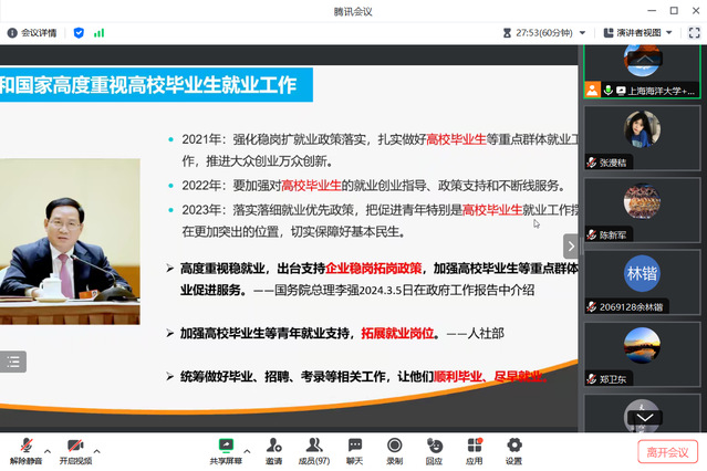 为扎实推进本科毕业生就业工作,学院于2024年3月7日18:00在线上顺利召开了2024届本科毕业生就业工作交流会暨毕业班家长会,参会家长多达100人。BEAT365唯一官网党委常委、宣传部部长、学院党委书记郑卫东、院长陈新军、就业指导员张宜振、毕业班辅导员杨芮、张漫秸以及学生代表朱丰强参加本次会议。会议由党委副书记石张东主持。