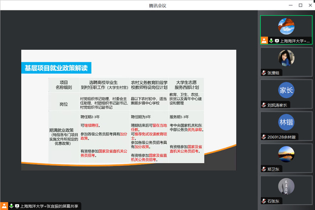 及时当勉励,在交流、提问环节,石张东、张漫秸、杨芮等诸位老师为家长答疑解惑,一方面,为大家提供全方位、多层次、多角度的就业指导,其次,强调学院在就业困难帮扶方面要落实“送政策、送指导、送技能、送岗位、送温暖”五个方面;再者,建议家长们鼓励和支持同学们积极就业,杜绝懒就业、慢就业、不就业的错误观念,把准迈出大学、迈向社会的人生方向。同时,在征兵、基层就业等方面进行了案例分析、分享。
